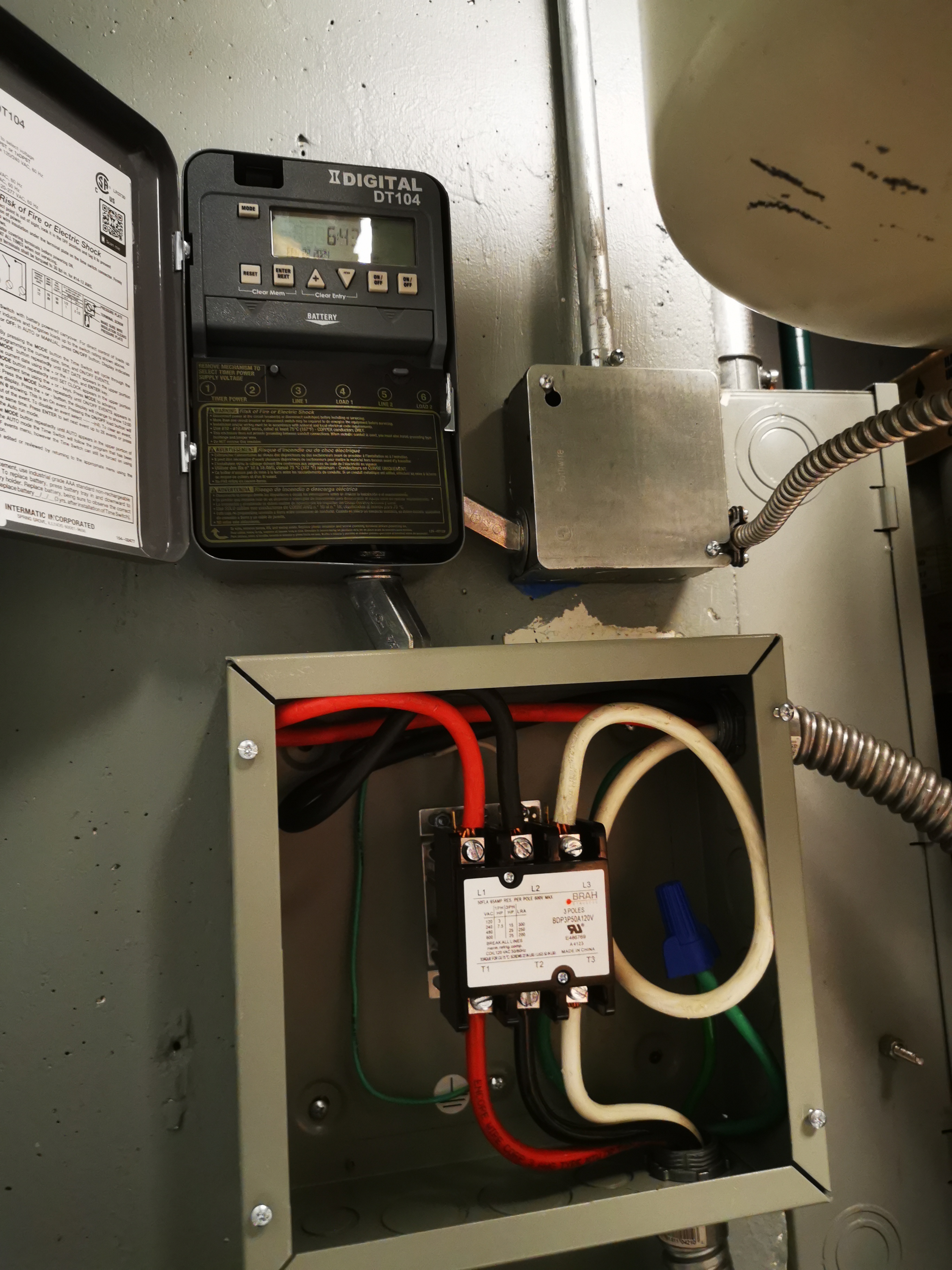 digital timer and contactor power electric water heater, pump and thermostat on a schedule