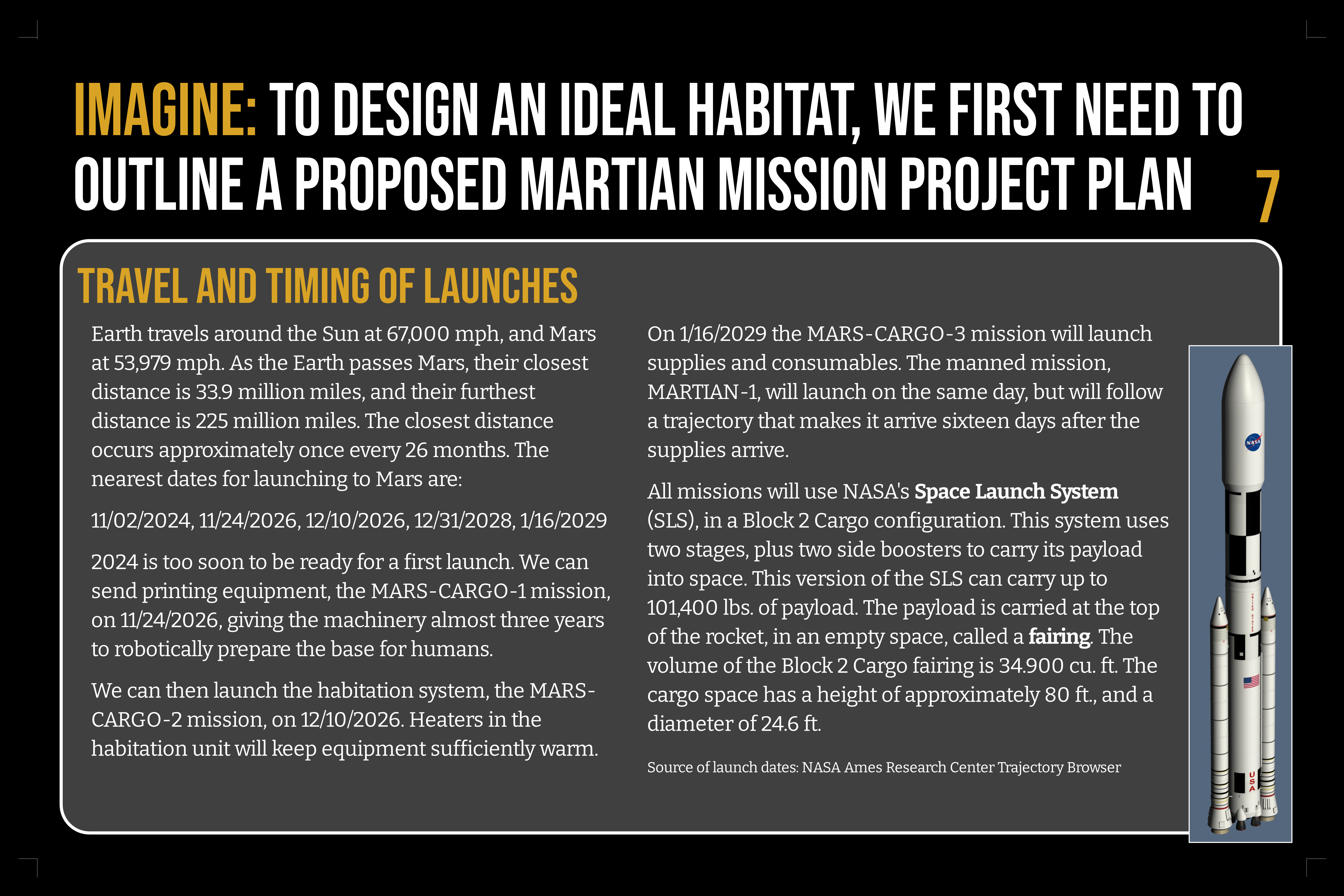 With all of the materials chosen and the design completed, building my habitat on Mars only requires figuring out when to send each load of materials, before humans make the trip to their new home. There are very limited windows of time where Earth and Mars are closely aligned for a quick, seven-month trip. According to NASA's online trajectory tools, there are flight windows available in 2024, 26, 28 and 29. By my calculations, we can send two equipment flights in 2026, and then send supply and human flights in 2029 for a successful Mars mission.