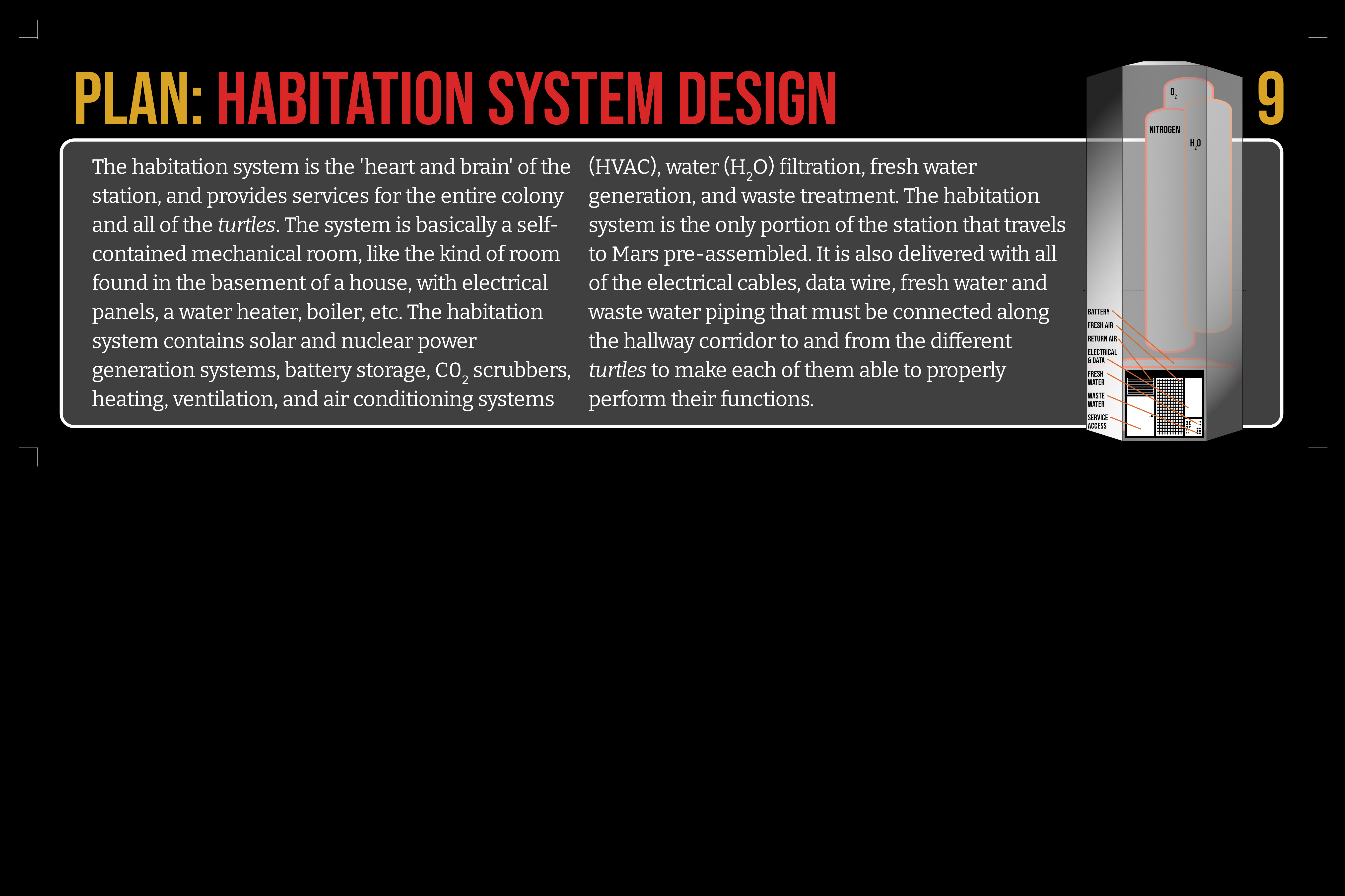 The final major part to consider was the life-support, or habitation system. The habitation system is the 'brains' of the station, and provides services for the entire colony and all of the turtles. The system is basically a self-contained mechanical room, like the kind of room found in the basement of a house, with electrical panels, a water heater, boiler, etc. The habitation system contains solar and nuclear power generation systems, battery storage, C02 scrubbers, heating, ventilation, and air conditioning systems (HVAC), water (H2O) filtration, fresh water generation, and waste treatment.
