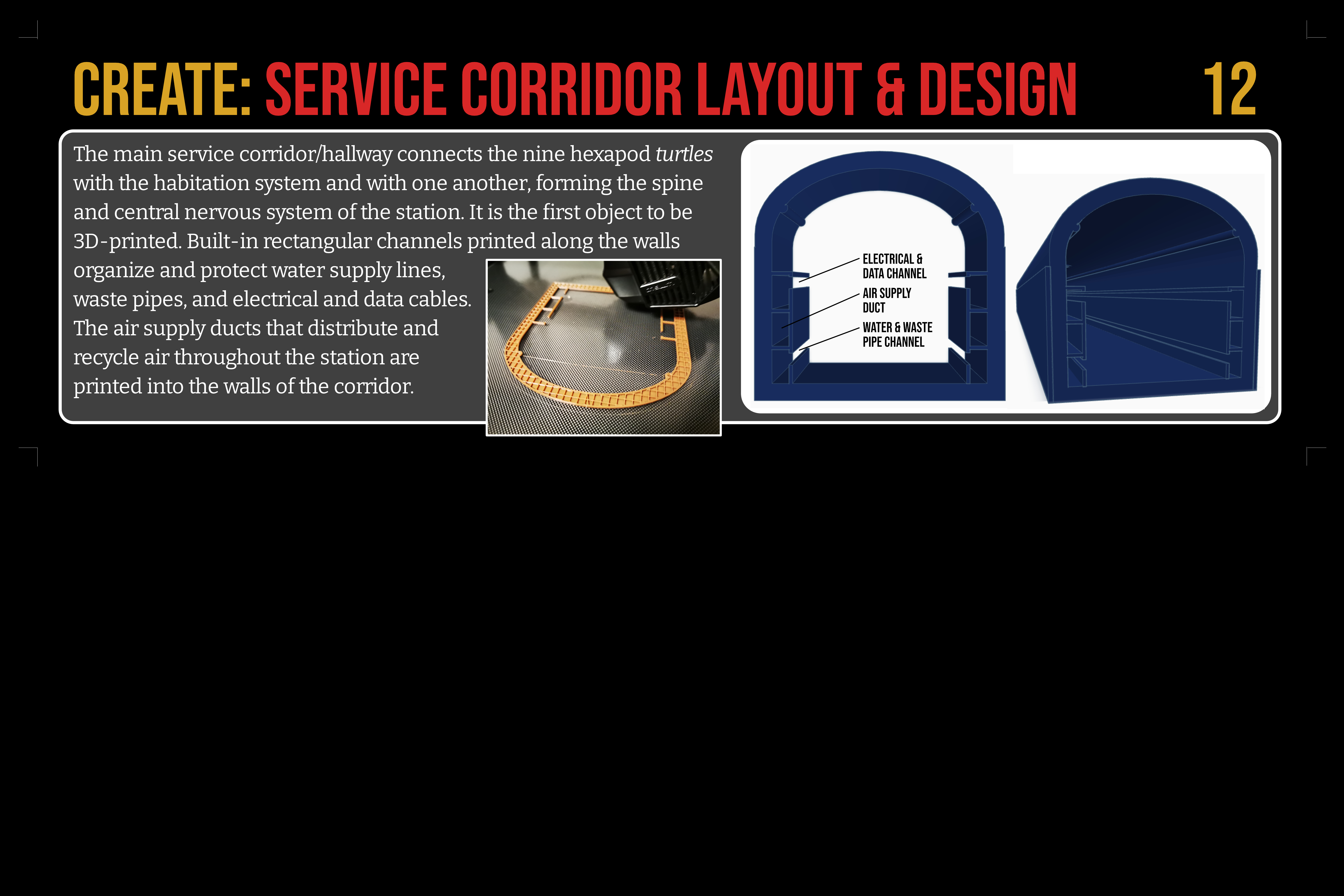 The corridor is 3D-printed with built-in rectangular channels to organize and hold water lines, waste pipes, electrical and data cables, and with ducts to distribute and recycle air throughout the station.