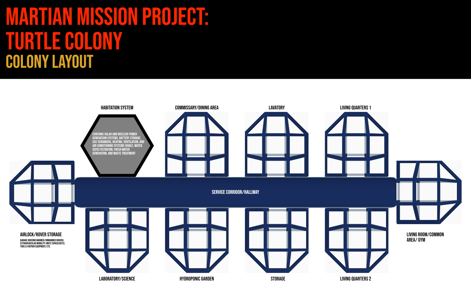 The final design is a six-sided, turtle-shaped structure that I obviously decided to call the Martian Turtle. This design keeps all of the benefits of the Elezering shape, while connecting to a shared corridor that brings life-sustaining services to each turtle.
