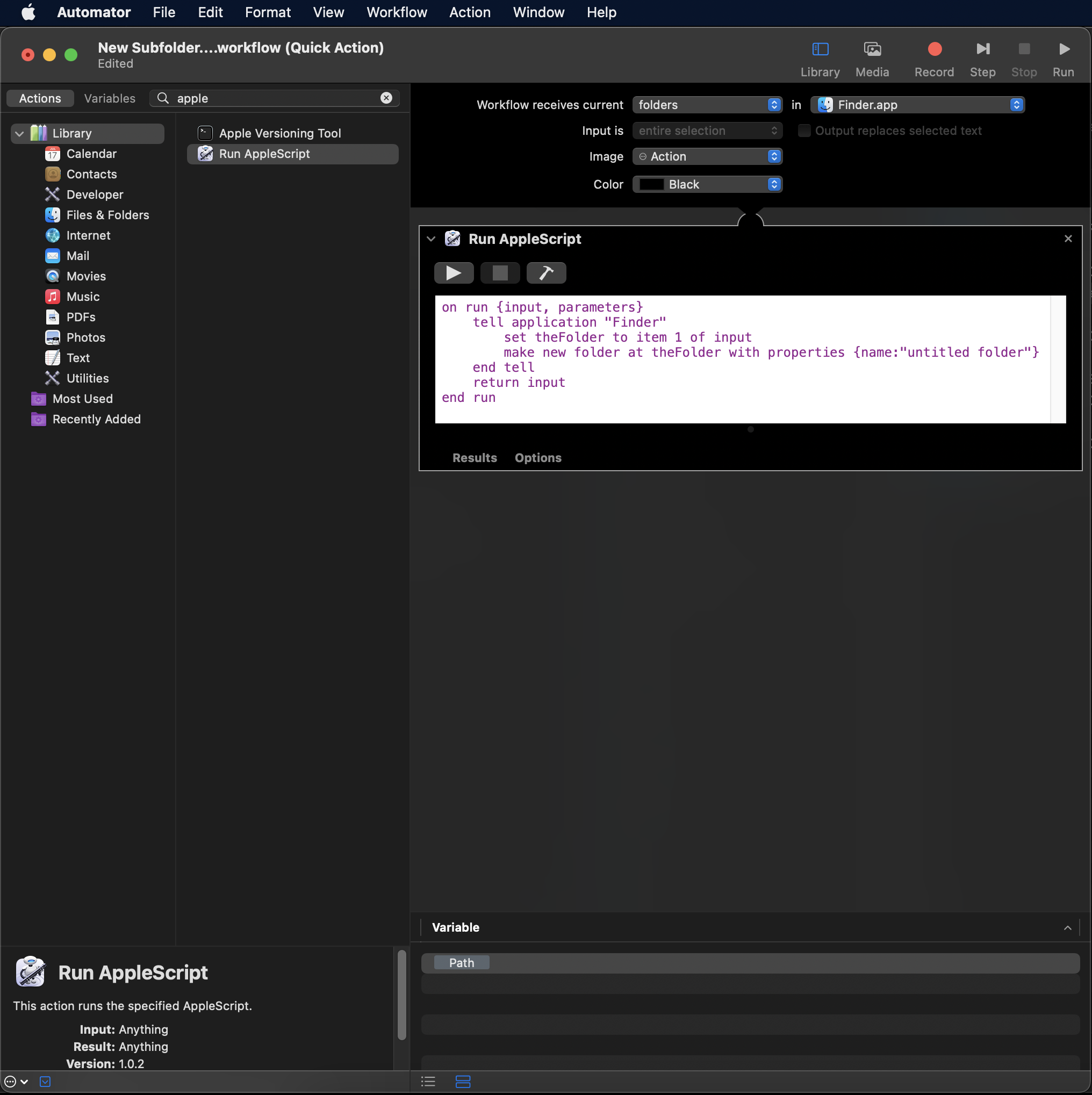 6. Select File > Save and title the new Quick Action with the name New Subfolder...