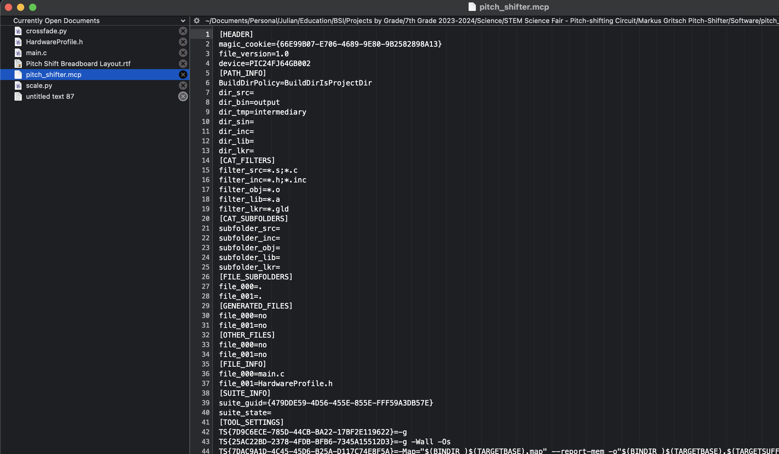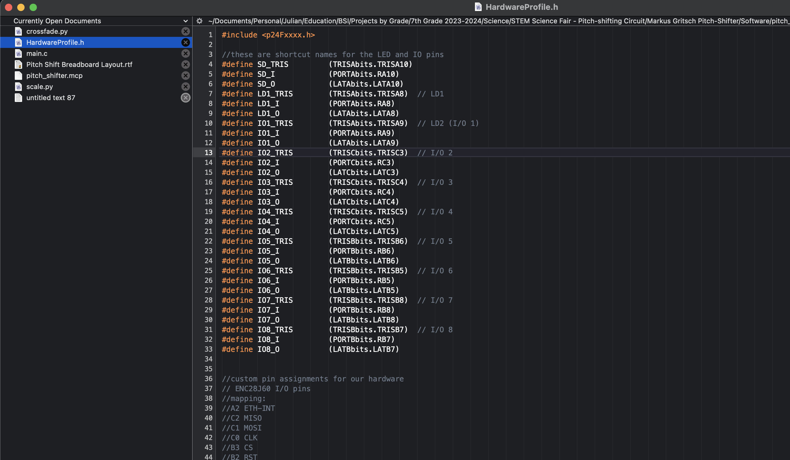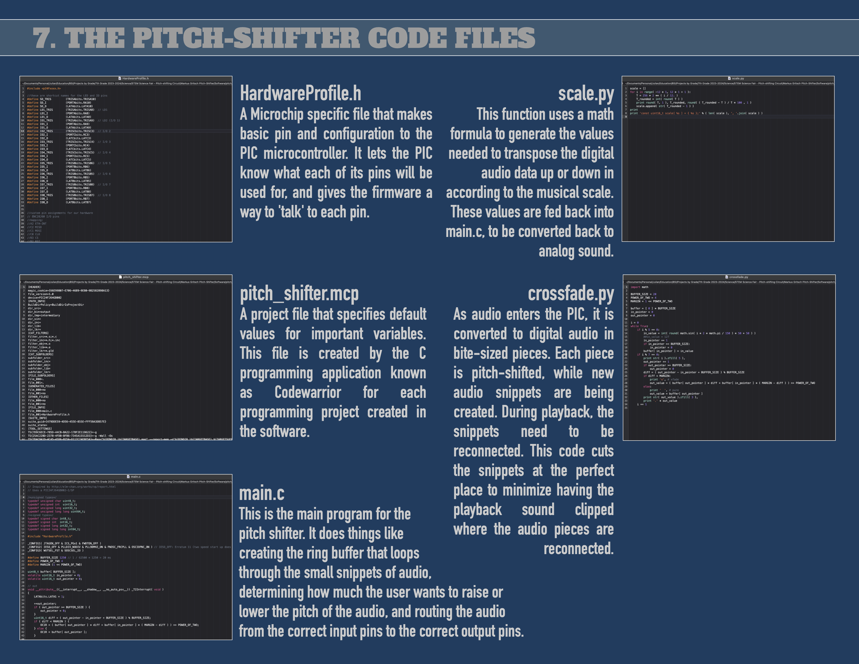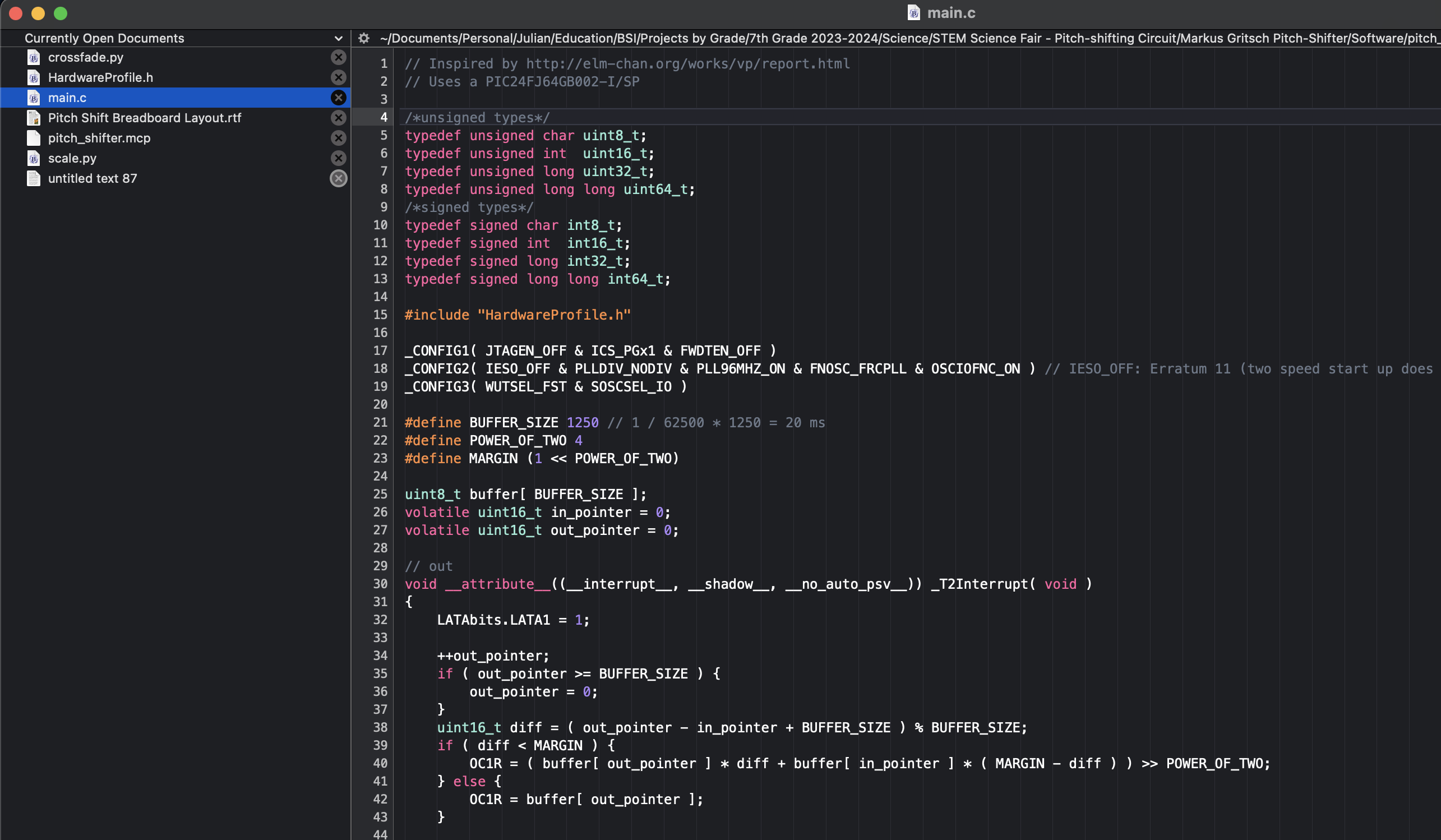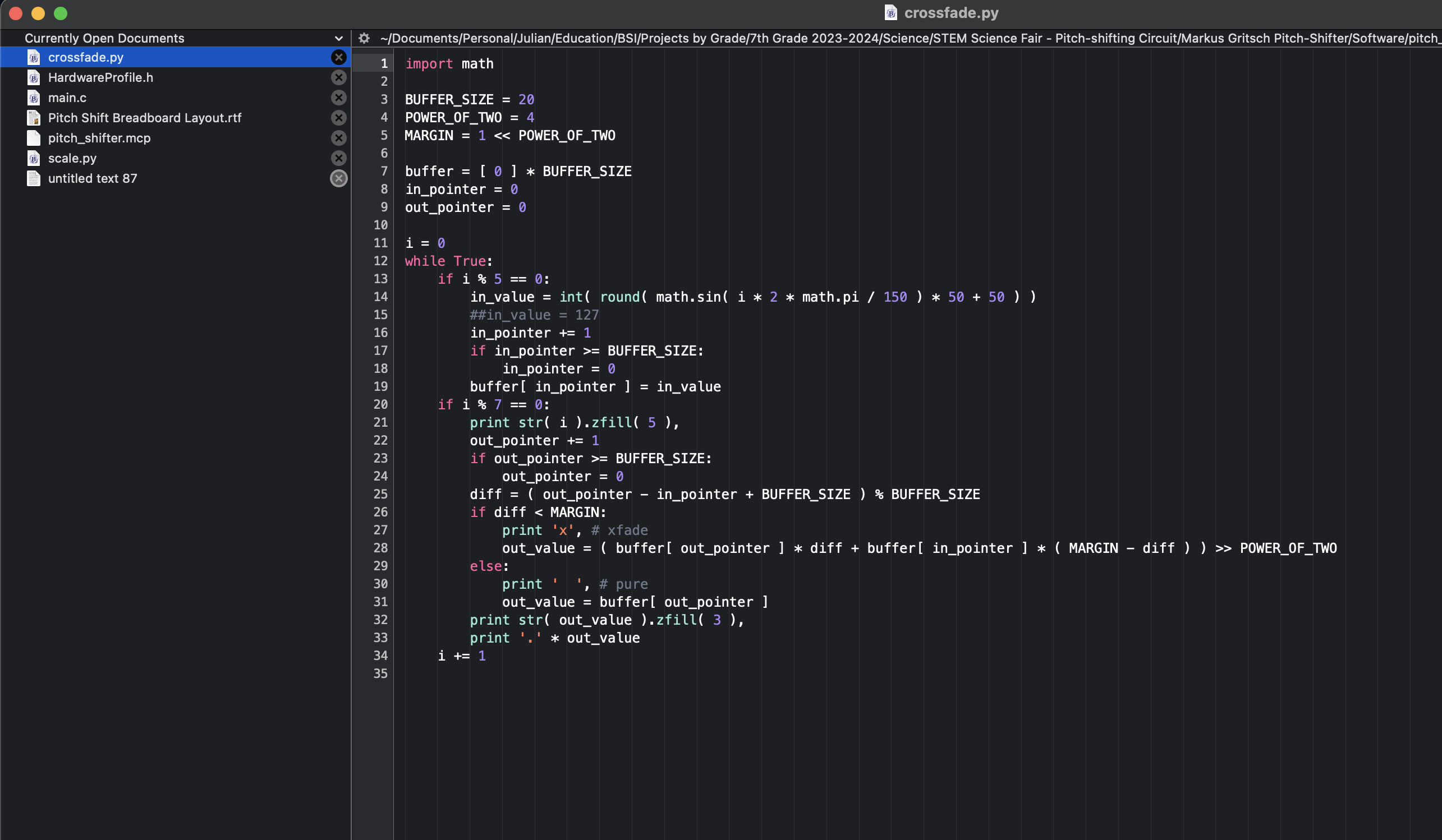 This is the main program for the pitch shifter. It does things like creating the ring buffer that loops through the small snippets of audio, determining how much the user wants to raise or lower the pitch of the audio, and routing the audio from the correct input pins to the correct output pins.