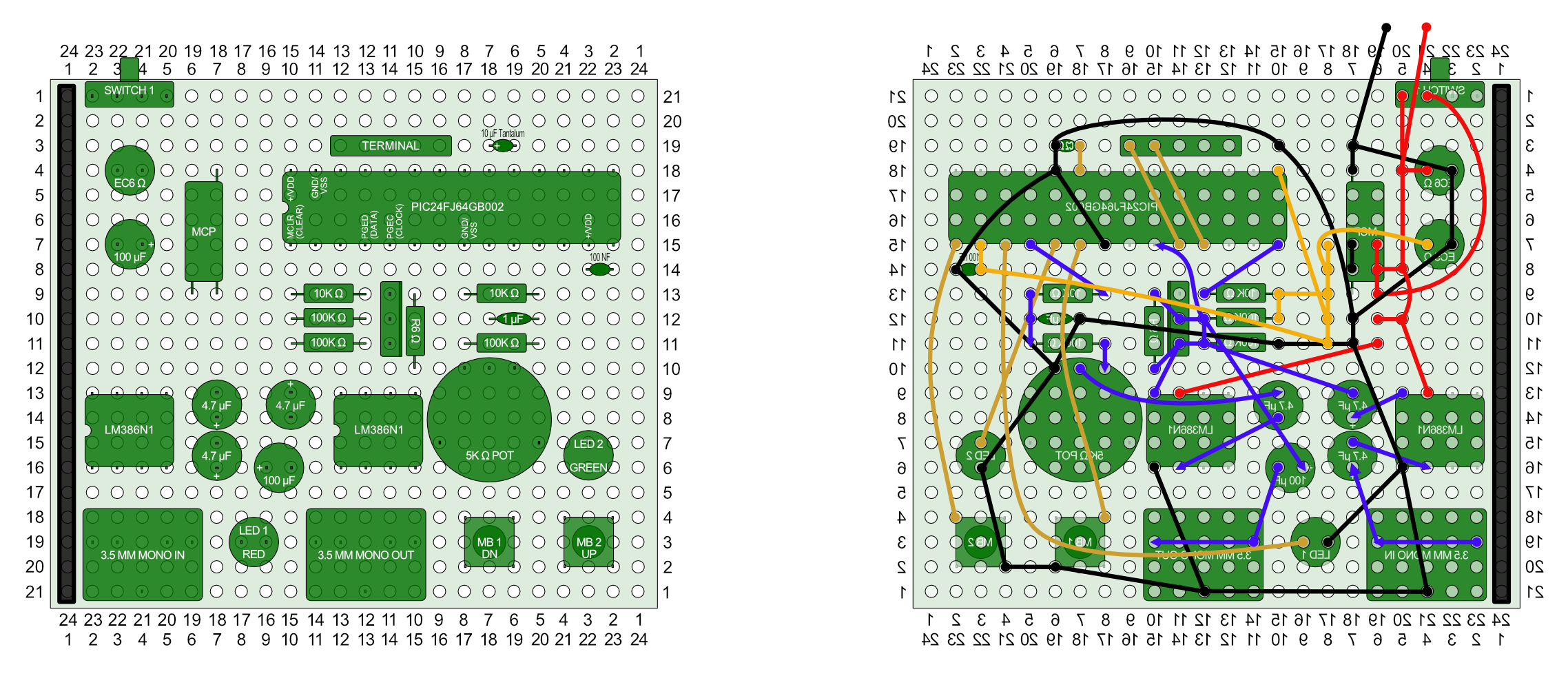This is my first attempt at designing a circuit layout for the pitch shifter. I used a graphic design program for this, but I next plan to lay this out in a proper piece of PCB design software.