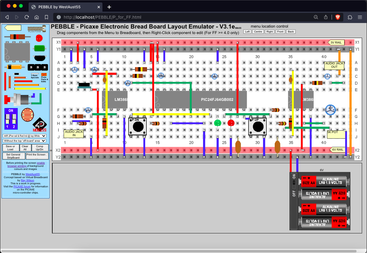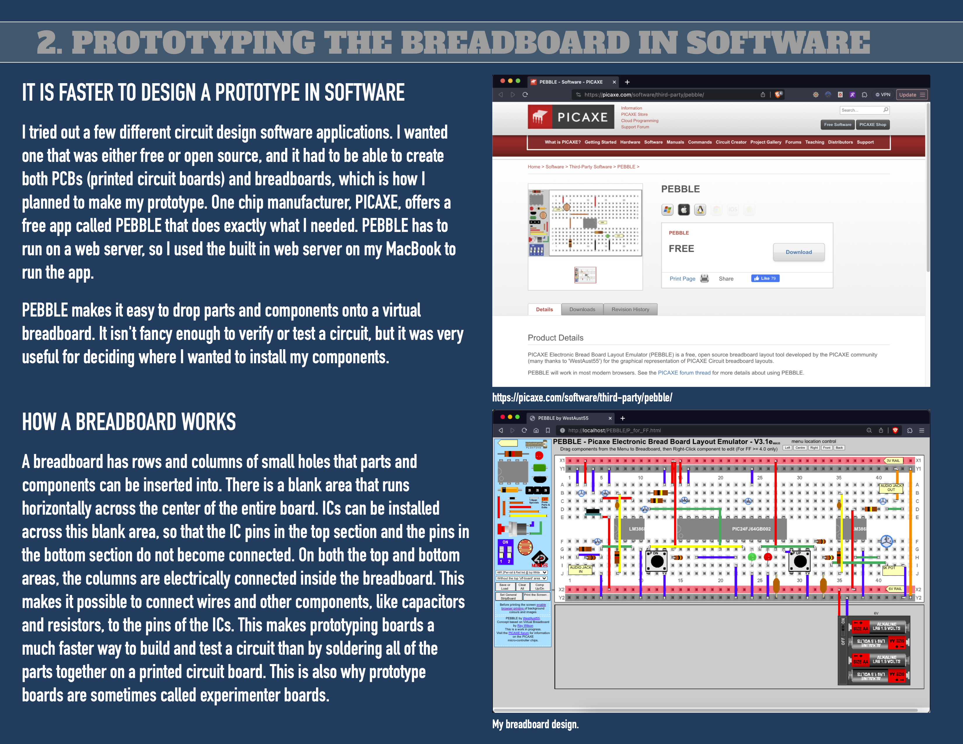 I tried out a few different circuit design software applications. I wanted one that was either free or open source, and it had to be able to create both PCBs (printed circuit boards) and breadboards, which is how I planned to make my prototype. One chip manufacturer, PICAXE, offers a free app called PEBBLE that does exactly what I needed. PEBBLE has to run on a web server, so I used the built in web server on my MacBook to run the app.