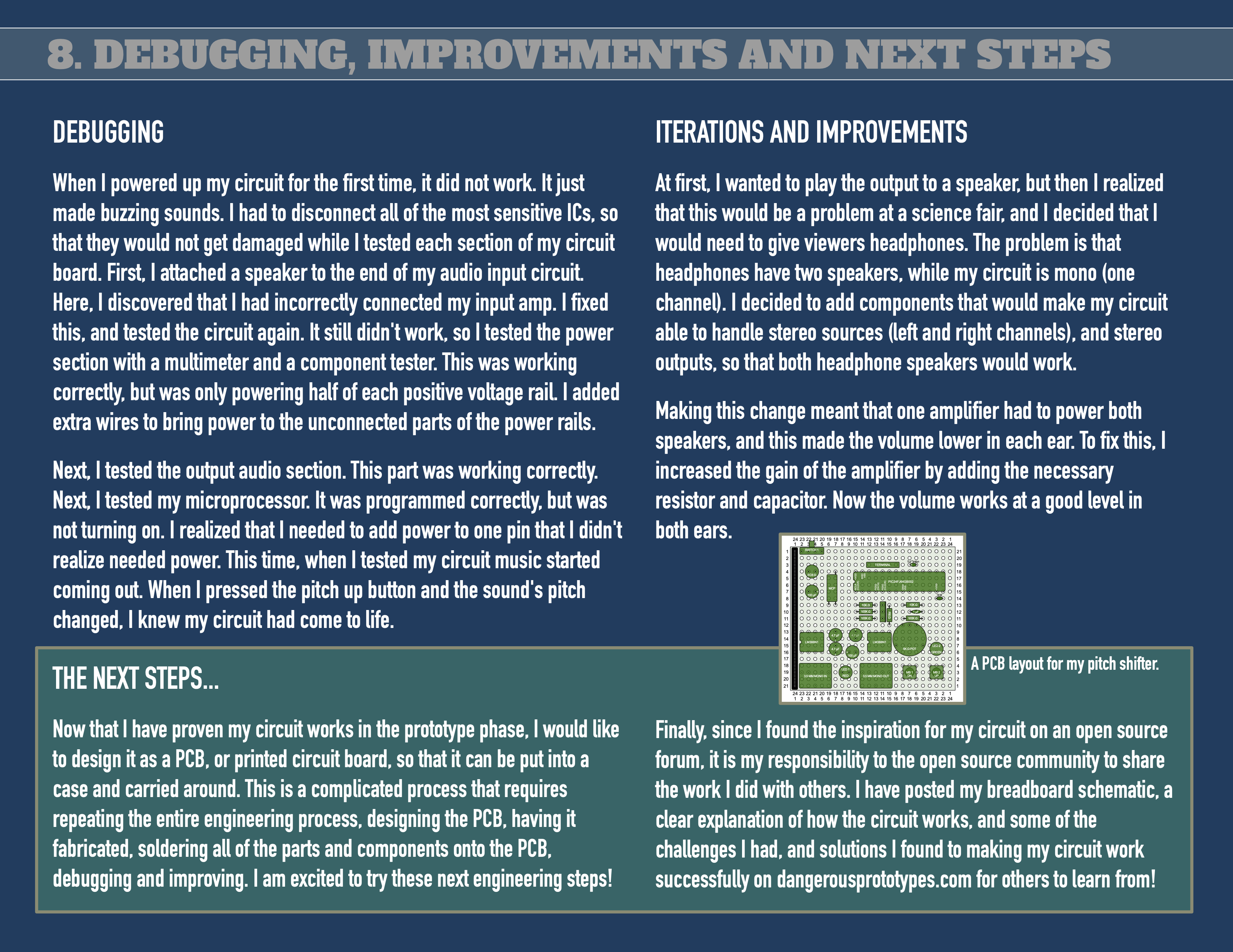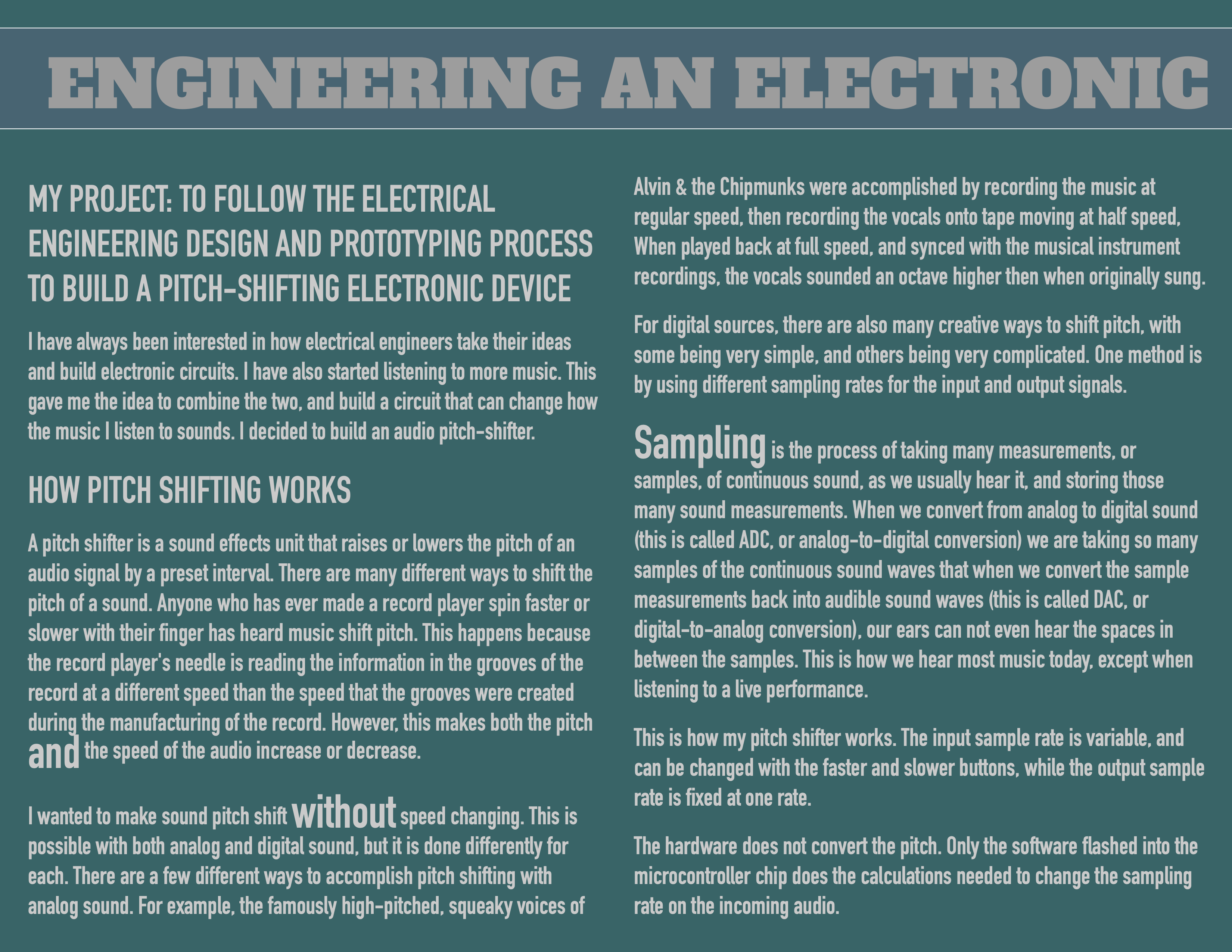 I have always been interested in how electrical engineers take their ideas and build electronic circuits. I have also started listening to more music. This gave me the idea to combine the two, and build a circuit that can change how the music I listen to sounds. I decided to build an audio pitch-shifter.