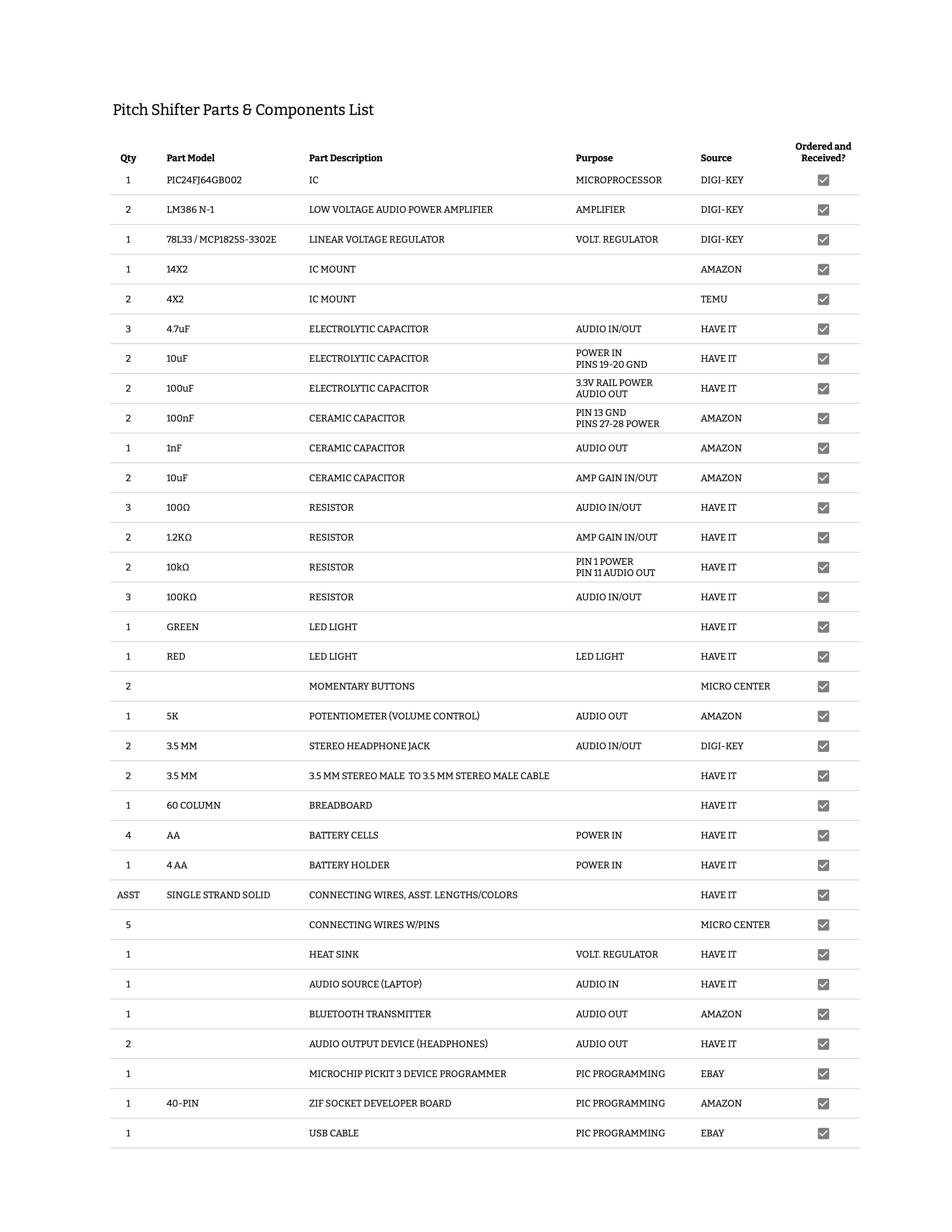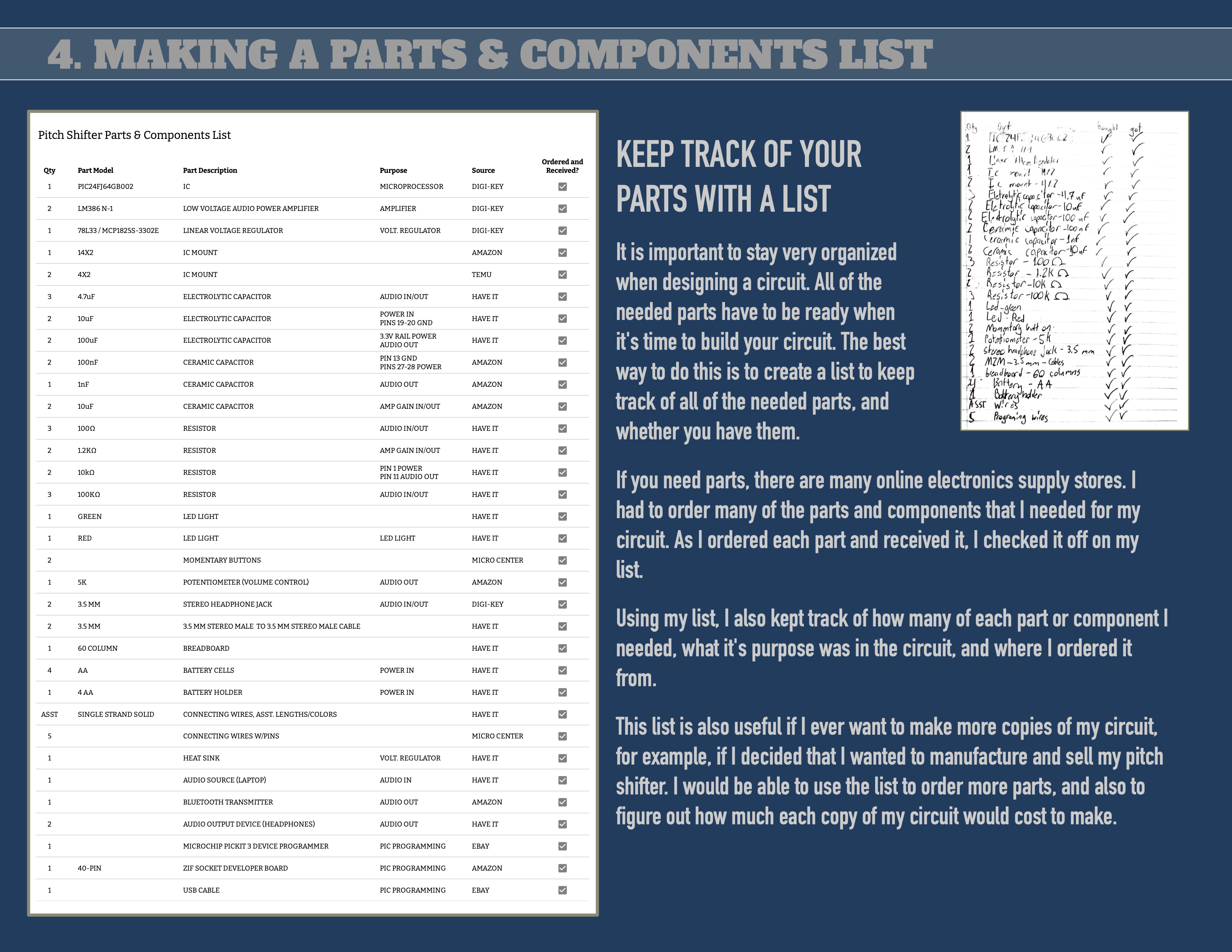 This list is also useful if I ever want to make more copies of my circuit, for example, if I decided that I wanted to manufacture and sell my pitch shifter. I would be able to use the list to order more parts, and also to figure out how much each copy of my circuit would cost to make.