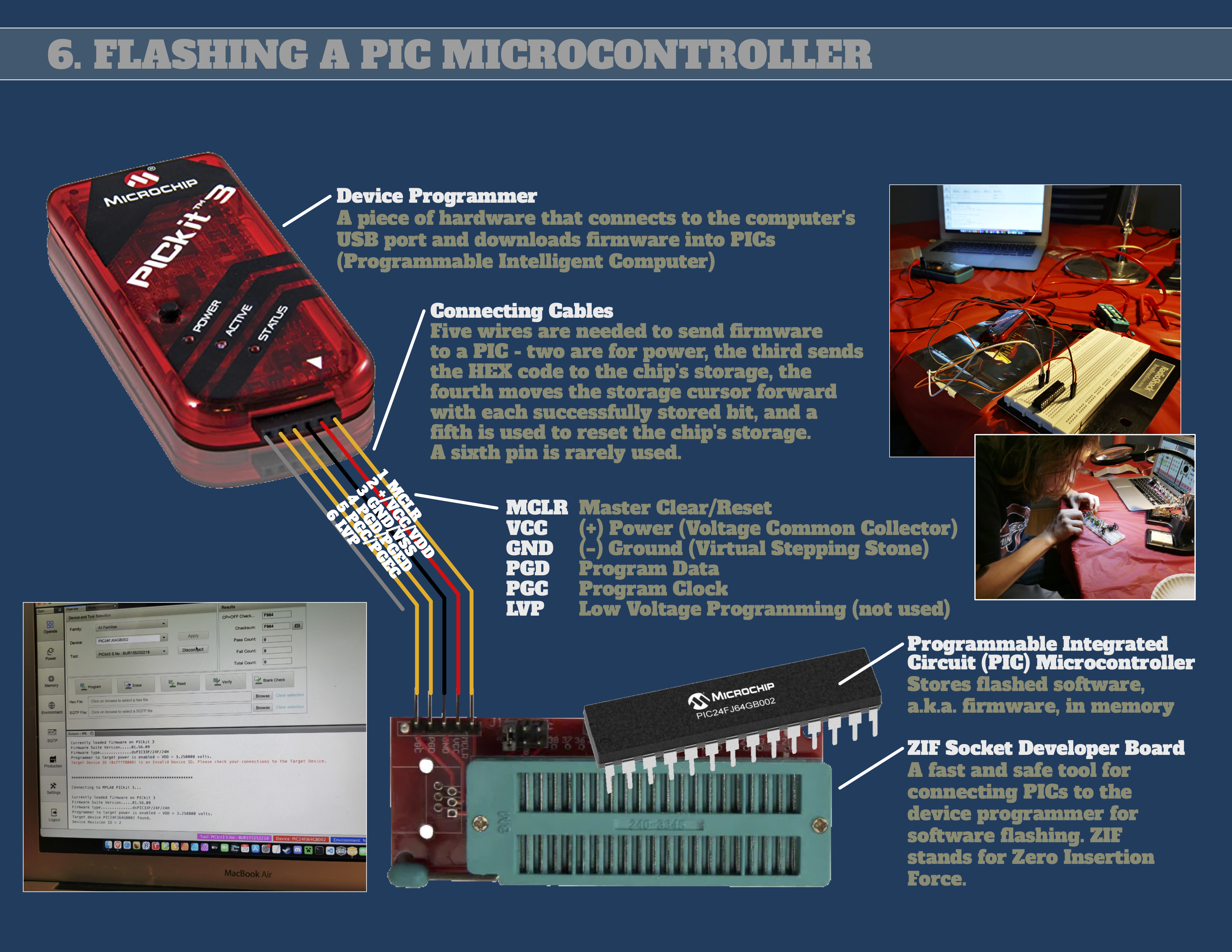 Five wires are needed to send firmware to a PIC - two are for power, the third sends the HEX code to the chip's storage, the fourth moves the storage cursor forward with each successfully stored bit, and a fifth is used to reset the chip's storage. A sixth pin is rarely used.
