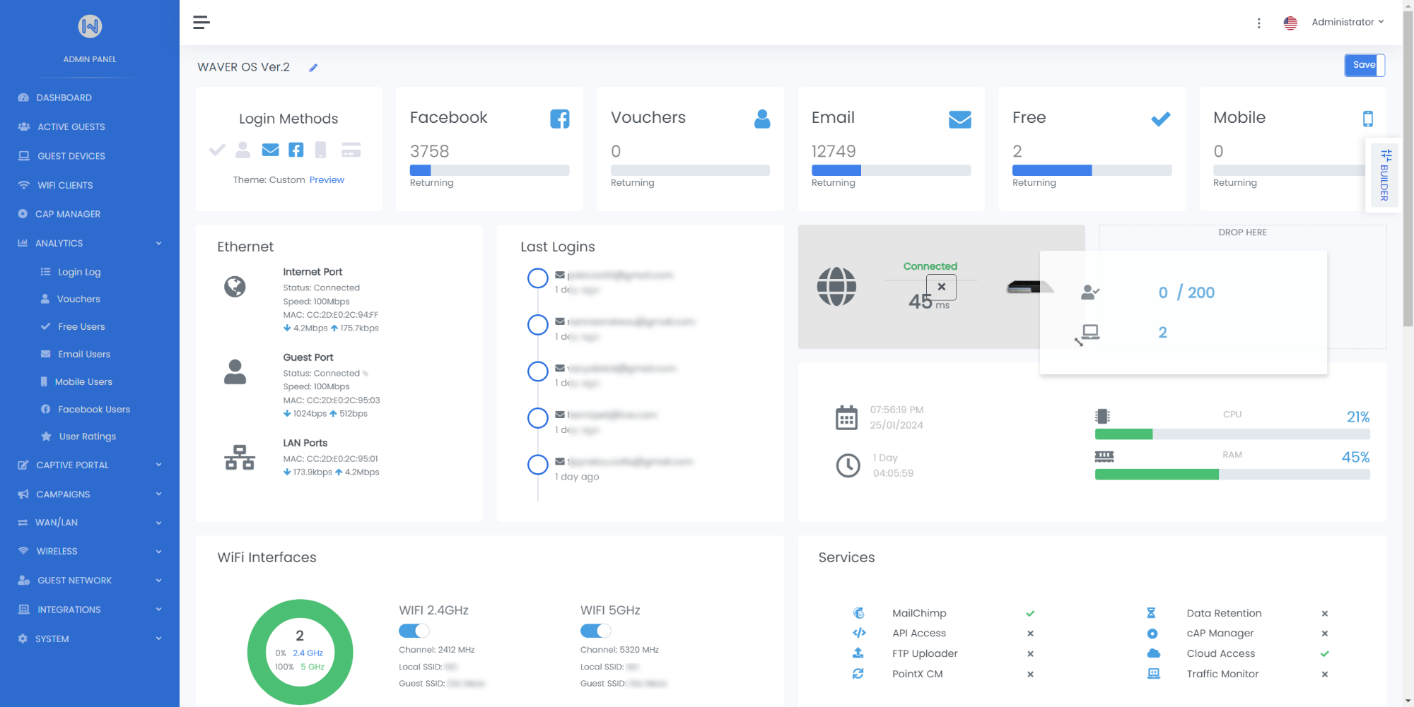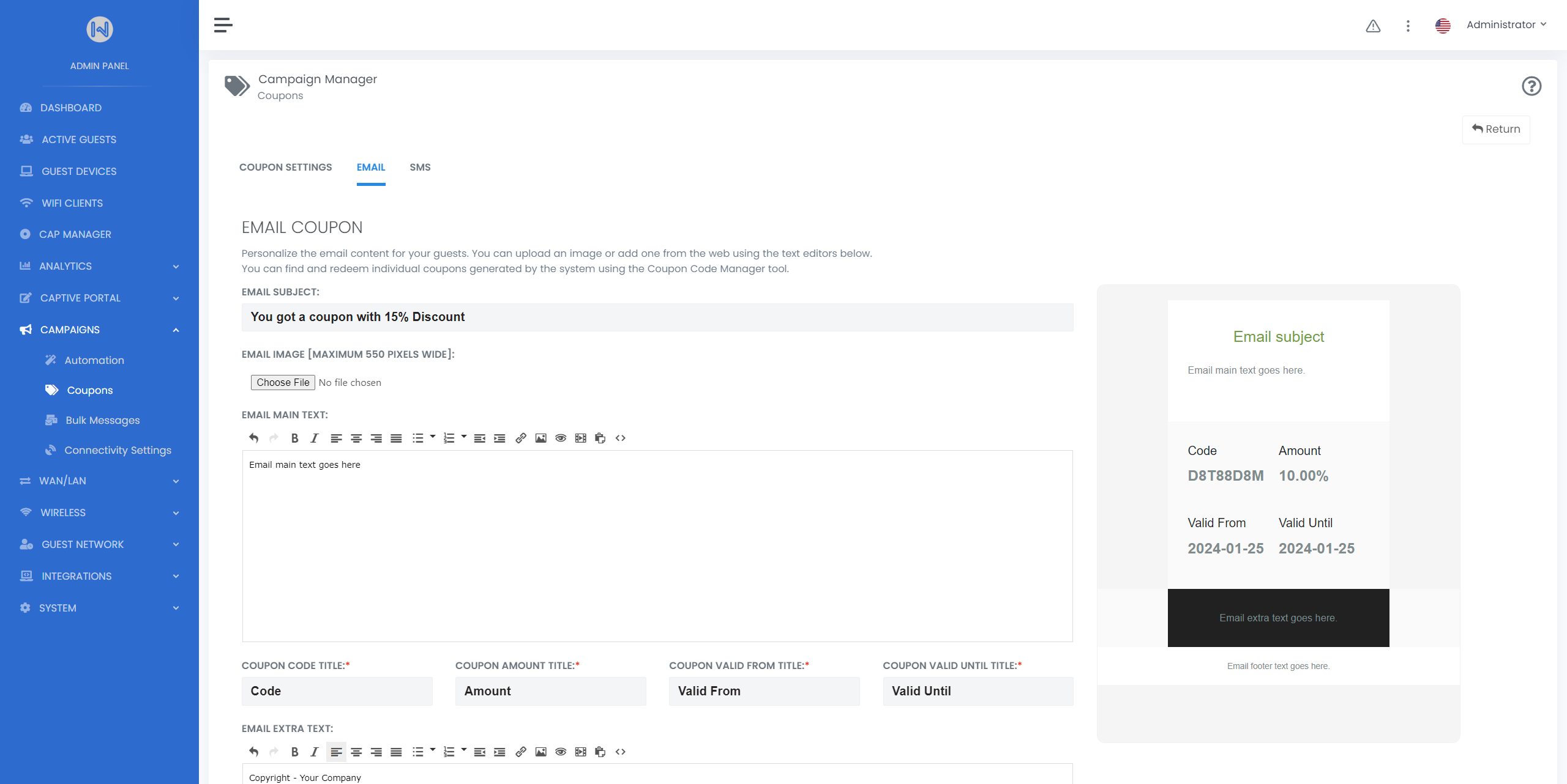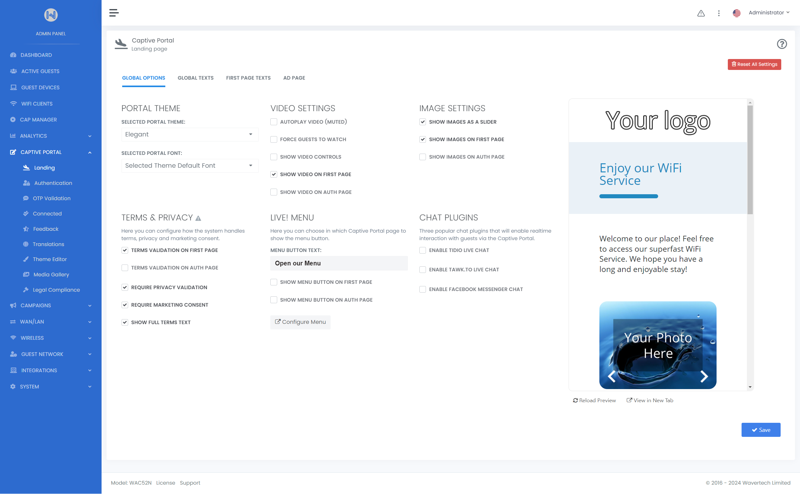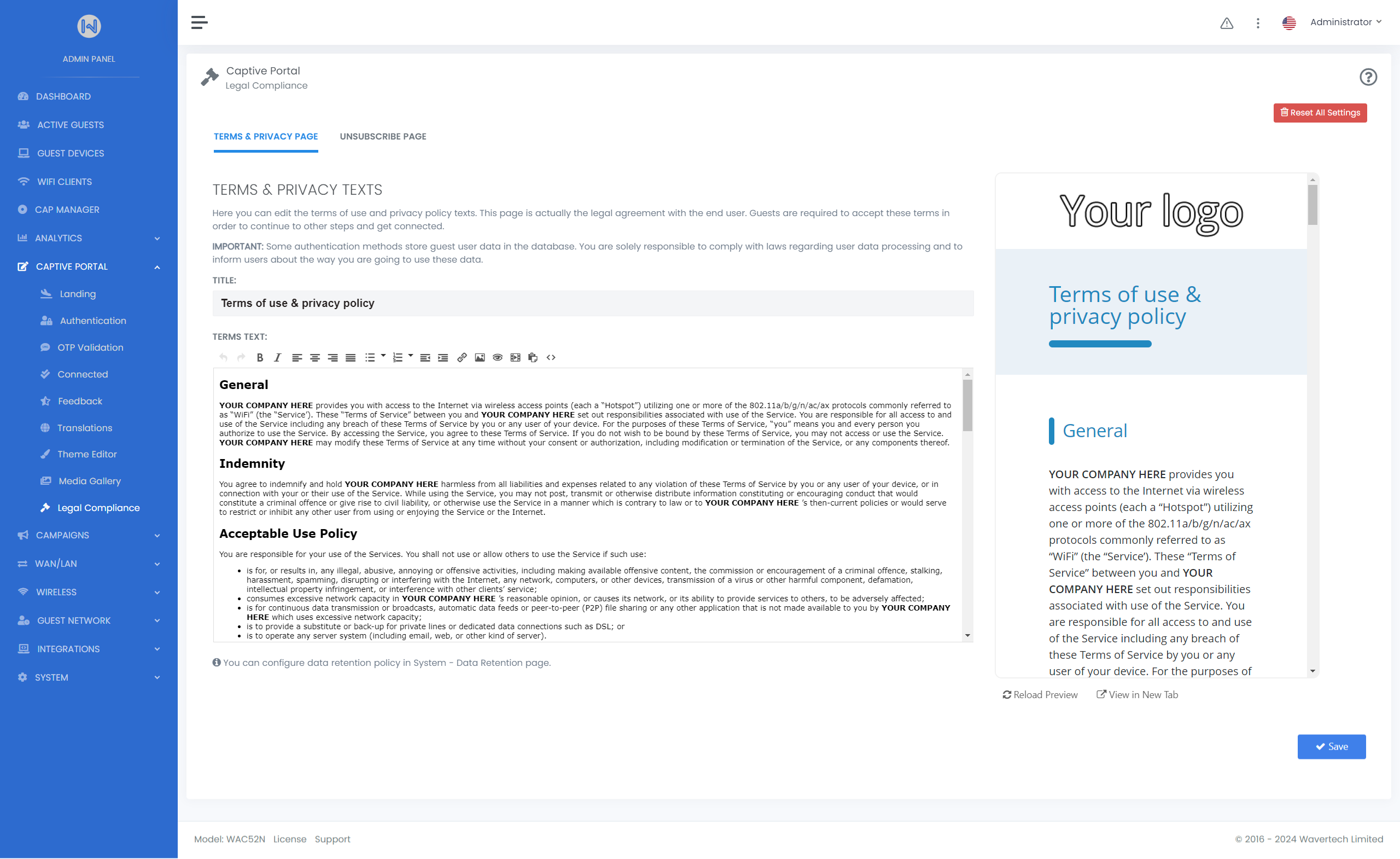 The portal page can optionally be used to exchange wi-fi access for email information, or sign-up to social media accounts, growing your mailing list, and allowing you to keep a connection with your customers.